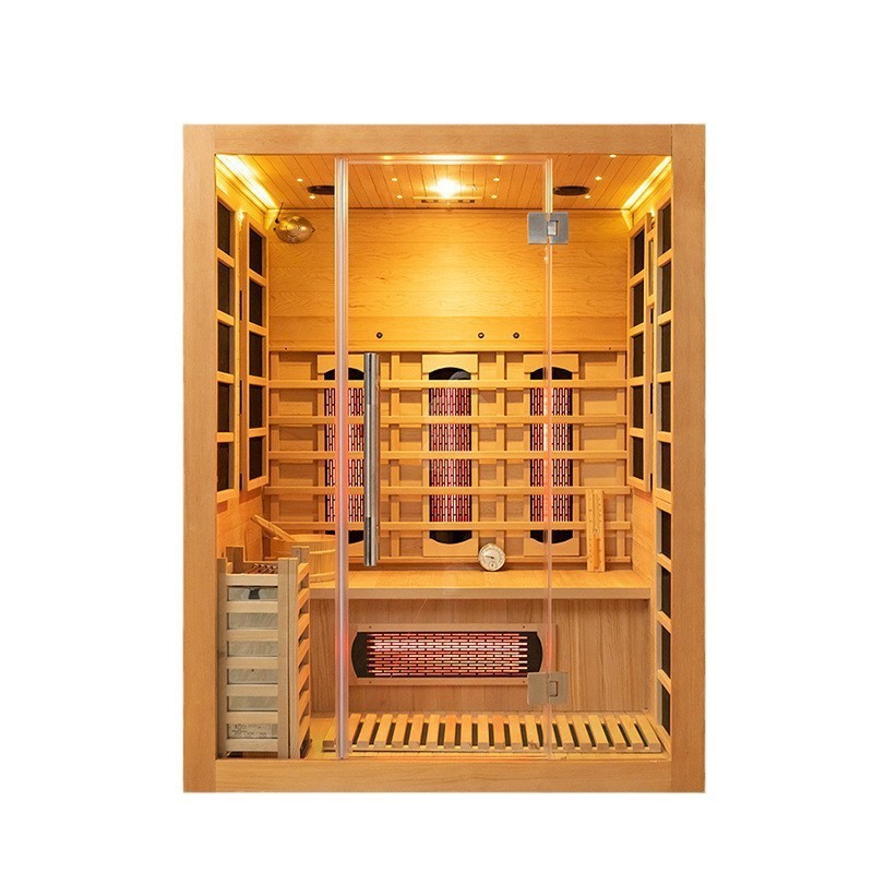 Le sauna infrarouge et à vapeur en bois pour 1 à 3 personnes est doté de fonctionnalités avancées pour améliorer votre parcours de bien-être : radiateurs infrarouges et plaques chauffantes en graphène infrarouge lointain (fournissent un chauffage uniforme et efficace pour une transpiration profonde et relaxante) ; Ioniseur d'oxygène (purifie l'air à l'intérieur du sauna, créant une atmosphère fraîche et revigorante) ; Lampe de lecture et haut-parleur (vous permet de lire ou d'écouter de la musique tout en profitant de votre séance de sauna) ; Panneau de commande (permet un réglage facile de la température, de l'heure et d'autres paramètres pour une expérience personnalisée) ; Poêle de sauna et tube à ondes lumineuses (travaillent ensemble pour générer de la vapeur et de la chaleur infrarouge, s'adressant à la fois aux amateurs de sauna à vapeur et à infrarouge lointain).