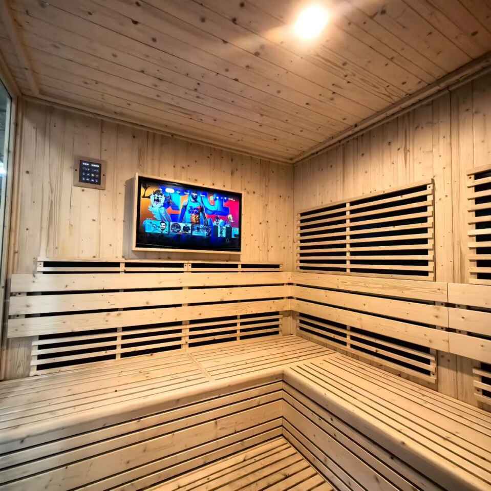 Le téléviseur LCD intégré (visible sur l'image) transforme l'expérience du sauna :